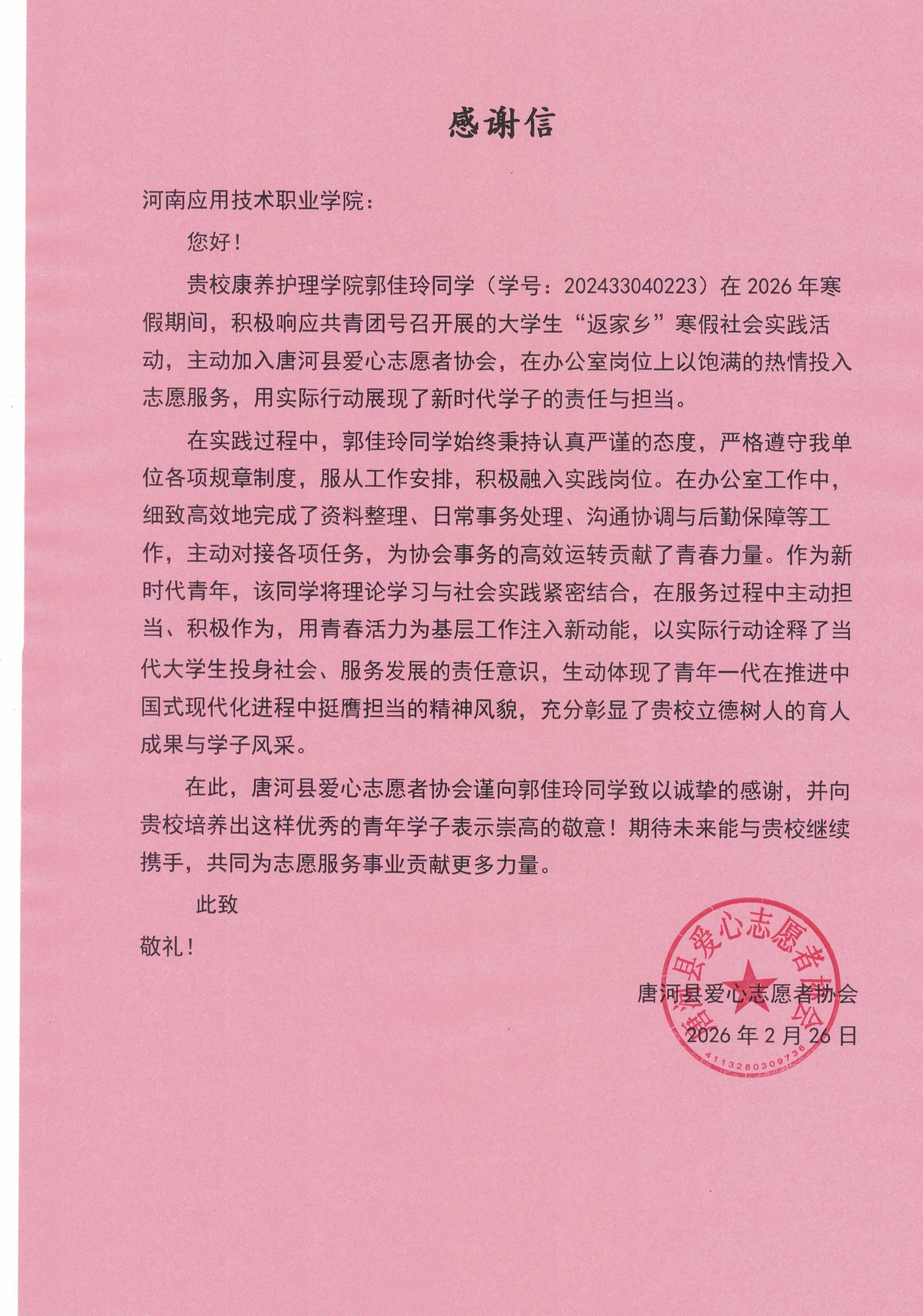 2026 年寒假,永利集团3044am康养永利集团3044am康复2402班郭佳玲同学积极响应共青团 “返家乡” 社会实践号召,前往唐河县新时代文明实践中心开展志愿服务,同时加入唐河县爱心志愿者协会参与多项工作。她以饱满的热情、扎实的行动扎根基层、服务家乡,生动诠释了新时代大学生的责任与担当,其出色的表现不仅收获了当地群众的认可,更被唐河县爱心志愿者协会专门致信感谢,彰显了康养永利集团3044am的育人成效。