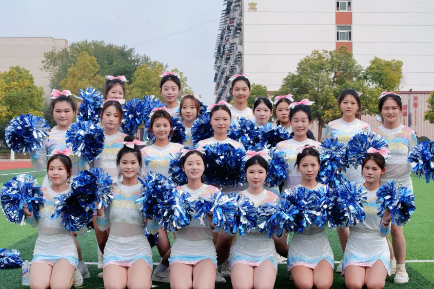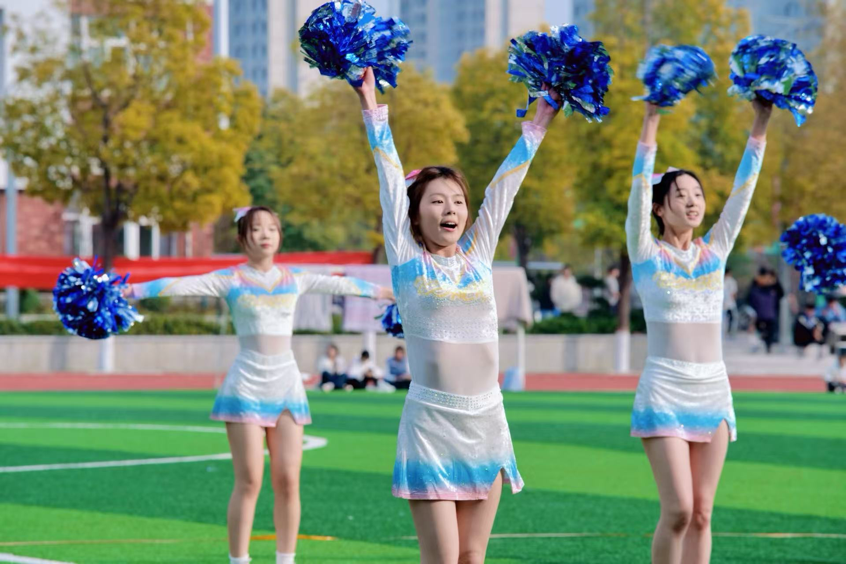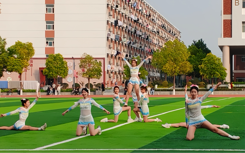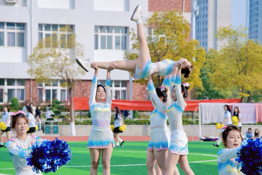 比赛现场气氛热烈非凡。啦啦操队员们手持花球,伴随着动感节拍灵动起舞,队形时而如繁花绽放,时而如浪潮奔涌,高难度的托举、同步的跳跃与灿烂的笑容交织成最富感染力的画面,将青春的活力与激情传递给在场的每一位观众;健身操则以刚柔并济的姿态惊艳亮相,刚劲有力的动作精准踩点,流畅多变的队形衔接自然,每一个伸展、每一次旋转都彰显着扎实的功底,展现出独特的运动魅力,赢得评委与观众的阵阵喝彩。