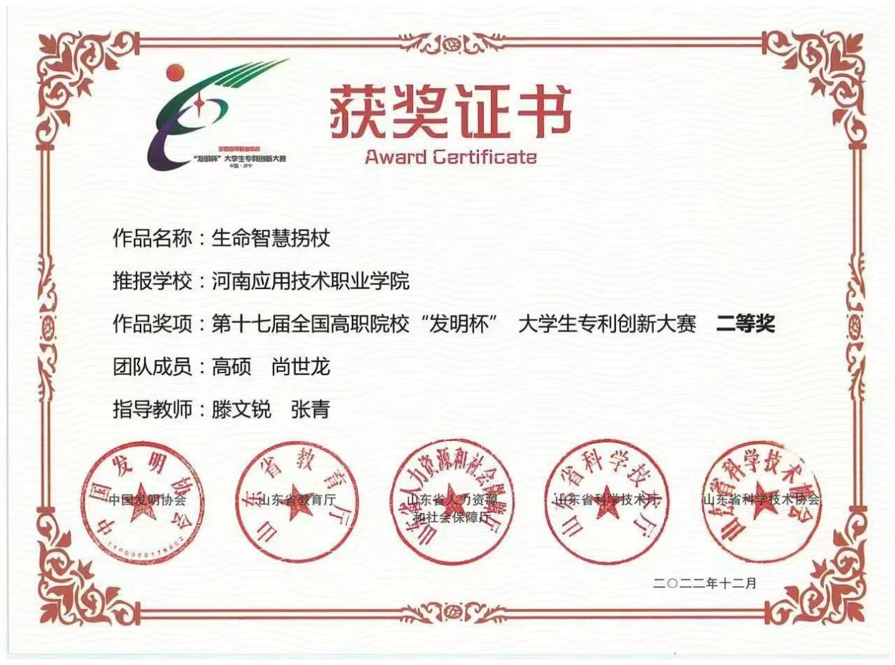 尚世龙在校期间担任班长,熟练运用各类办公软件完成文件整理、文书撰写等工作,锤炼出扎实的办公实操能力。他积极投身创新实践,凭借作品《生命智慧拐杖》斩获第十七届全国高职院校“发明杯”大学生专利创新大赛二等奖,展现出极强的创新思维与实践能力。